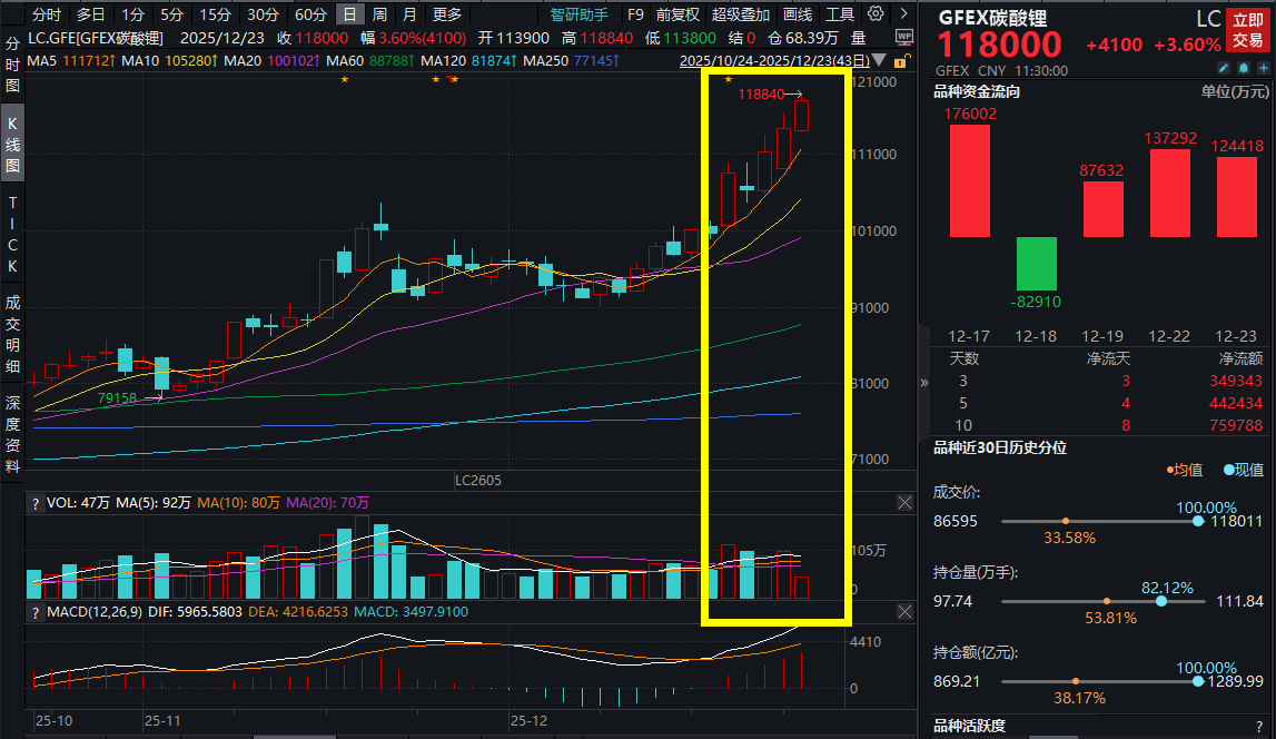 碳酸锂方面,碳酸锂期货再度大涨超3%,加上今天已连续3天涨超3%,本周碳酸锂现货价格继续抬升,江西某大型云母锂矿12月18日进行第一次环评公示,中信建投按照正常公示及审批流程推算,认为其复产时间将较预期再度推迟,12月复产无望,1月内复产也存难度,消费淡季累库预期进一步削弱,低库存水平为来年价格继续上扬提供支撑。(来源于中信建投20251223《江西云母矿复产推迟,低库存或放大锂价向上弹性》)