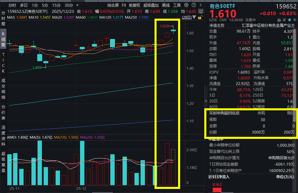 12月23日,A股小幅震荡,有色50ETF(159652) 一度涨超2%,截至13:39,涨0.63%,冲击3连涨,盘中价创上市以来新高。资金盘中借道ETF跑步进场,截至发稿,实时数据显示,有色50ETF(159652)获净申购3100万份,按盘中成交均价估算,有色50ETF(159652)盘中净申购金额已超5000万元!
